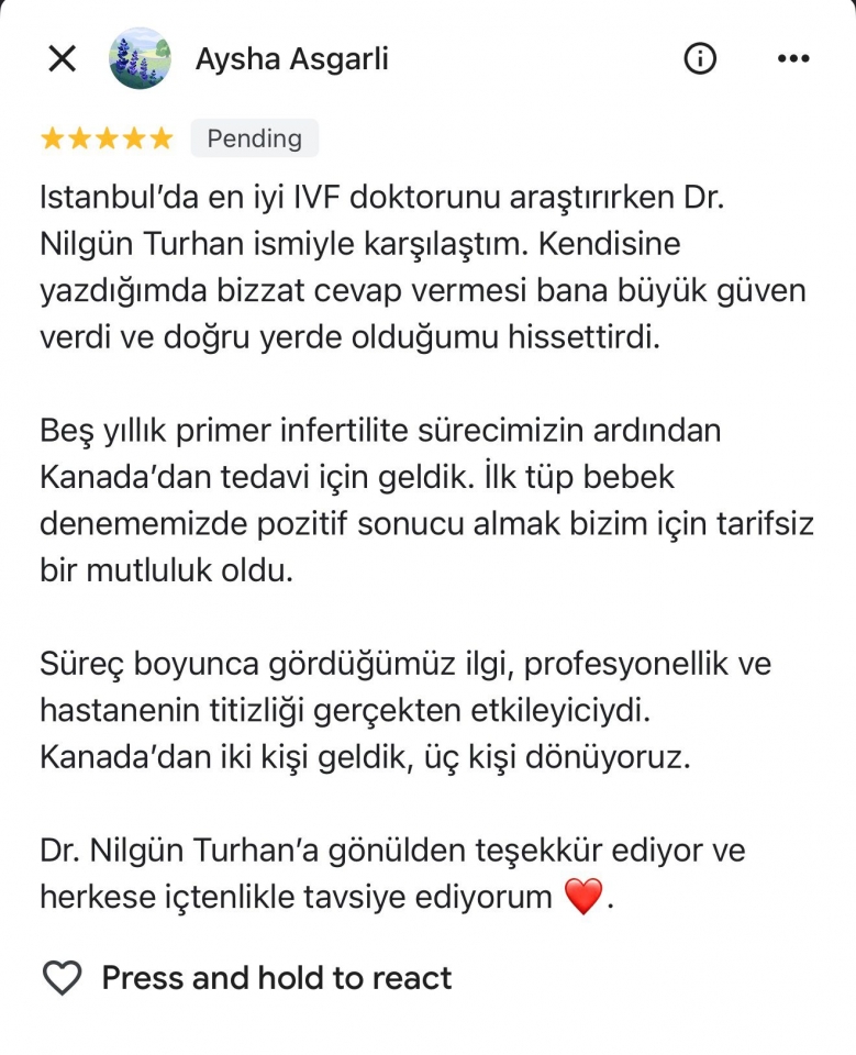 While researching the best IVF doctor in Istanbul, I came across Dr. Nilgün Turhan. When I reached out to her, she personally responded, which gave me great confidence and reassured me that I was in the right place. After five years of primary infertility, we traveled from Canada for treatment. Receiving a positive result on our very first IVF attempt was an indescribable joy for us.